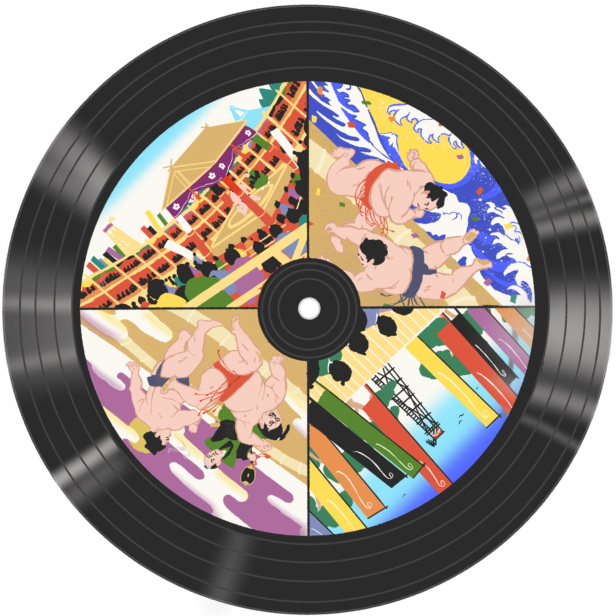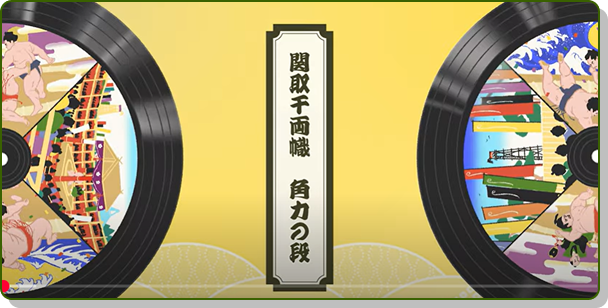 丸い絵を回し、勝つか負けるかという相撲の取組のイメージを表現しました。