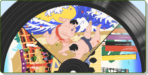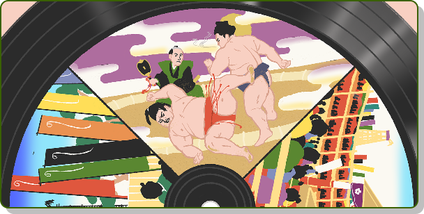 丸い絵を回し、勝つか負けるかという相撲の取組のイメージを表現しました。