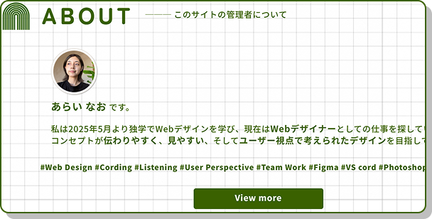 明快な印象を持たせるため、特にTOPページでは流し見れば一通りの情報が得られるようにしました。 ABOUTのセクションは自己紹介とサイトの概要の説明を兼ねています。WORKSのセクションにはバナーを配置し、何ができるのかを端的に表しました。
